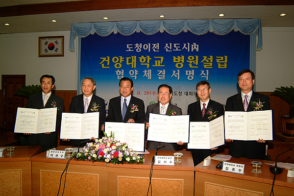 이완구 충남도지사는 29일 오전 11시 도청 대회의실에서 김희수 건양대 총장, 김종우 건양대병원장과 도청 신도시 사업시행자인 홍인의 충남개발공사 사장, 신열 대한주택공사 대전충남지역본부장, 김광수 한국토지공사 대전충남지역본부장 등 6개 기관장이 참석한 가운데 ‘건양대학교 병원’ 설립을 위한 MOU를 체결했다.