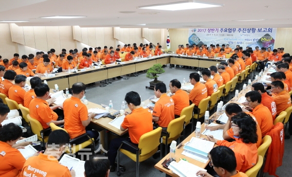 충남 보령시는 민선6기 3년 결산과 함께 2017 상반기 시정성과 공유, 하반기 시정방향과 발전을 모색하기 위해 김동일 보령시장을 비롯한 관계 공무원 등 180여명이 참석한 가운데 5일주요업무 추진 상황, 현안·공약사항 등에 대한 주요업무 추진상황보고회를 가졌다.