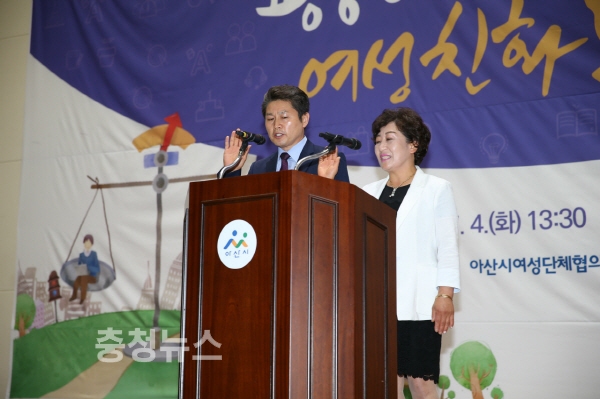 아산시 양성평등대회 복기왕 시장 인사말 모습