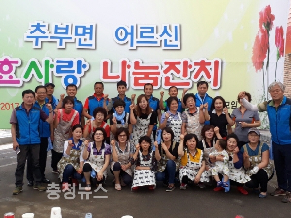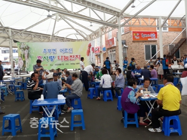 금산군 추부를 사랑하는 모임(회장 홍기방)은 지난 3일 강익성 사무국장을 비롯한 자원 봉사자 20여명이 금산군 추부면 마전시장에서 ‘효사랑 나눔잔치’를 개최 했다.