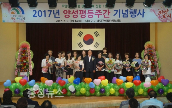 대전 대덕구(구청장 박수범)는 5일 대덕구평생학습원에서 양성평등주간(7.1.~7.7.)을 맞이해 ‘주민이 행복한 여성․가족 친화 1등 도시 대덕구!’라는 주제로 대덕구여성단체협의회(회장 양순덕) 주관 양성평등주간 기념행사를 열었다.