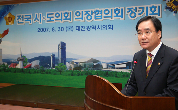 이번 전국시․도의회의장협의회 2007년도 정기회를 대전에서 개최하게 된 것을 기쁘게 생각한다”며 “이번 정기회를 통해 한자리에 모인 전국시․도의장협의회가 한마음 한뜻으로 힘을 합치고 공동의 연구와 노력을 펼쳐나간다면 진정한 지방분권을 통한 지역발전과 나아가 국가발전이라는 큰 목표를 이룰 수 있을 것”이라고 강조했다.