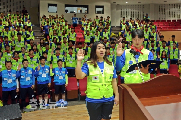 단국대 국토대장정 출정식에서 재학생 대표가 선서를 하고 있다.<왼쪽 구예지(국어국문학과 4년), 오른쪽 이재권(녹지조경학과 4년)>