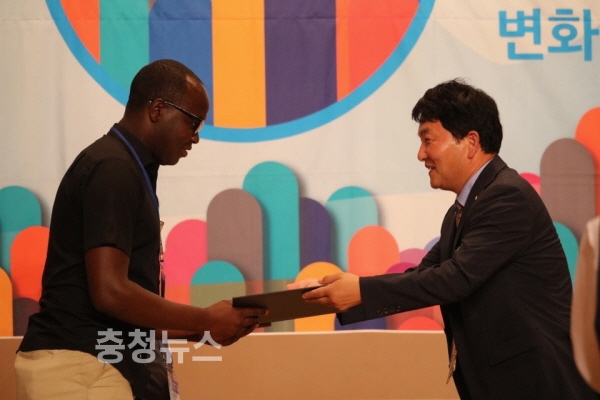 특별장학생으로 선발된 케냐 출신의 코스마스 킵치르치르 킴보이씨(26·순천향대학교 전자공학부3)는 2013년 9월부터 순천향대학에서 한국어 어학과정을 수료하고 현재 동 대학에서 전자공학을 공부하고 있다.