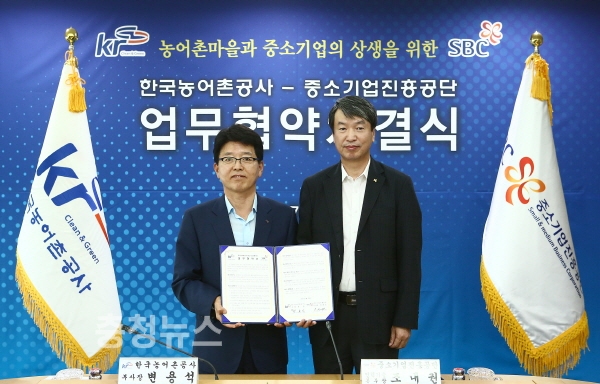 농어촌공사 변용석 부사장(왼쪽)과 중소기업진흥공단 조내권 본부장(오른쪽)이 업무협약 체결 모습