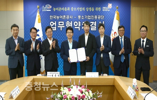 농어촌공사 변용석 부사장(왼쪽에서 4번째)과 중소기업진흥공단 조내권 본부장(오른쪽에서 4번째)이 업무협약 체결