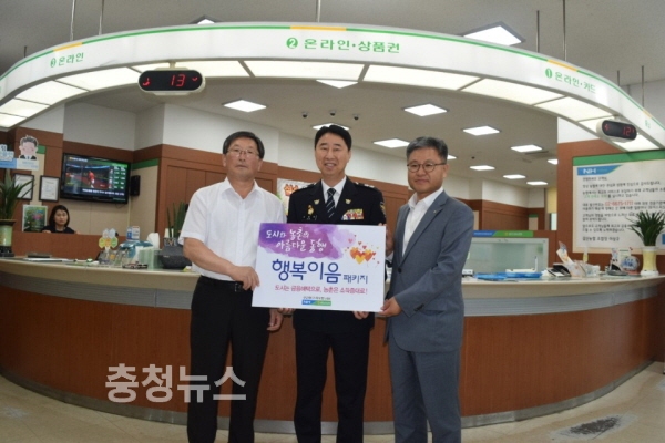 농협 충남지역본부(본부장 유찬형)은 도농상생과 농가소득 증대를 지원하는 ‘행복이음패키지’ 릴레이 가입행사를 11일 김재원 충남경찰청장과 함께 가졌다.