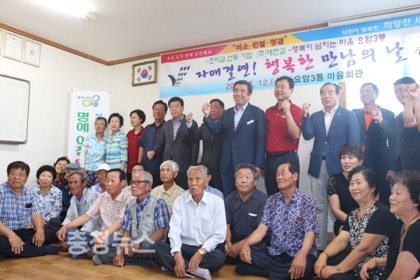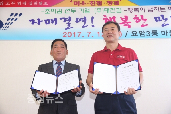 행사는 김동일 시장과 최민순 ㈜대천김 대표, 이홍배 요암3통장, 마을 주민 등 50여 명이 참석한 가운데 자매결연 취지 및 회사·마을 소개, 기업대표와 마을이장의 자매결연증서 서명 및 교환, 기념품(125만원 상당의 조미김) 증정, 오찬의 순으로 진행됐다.