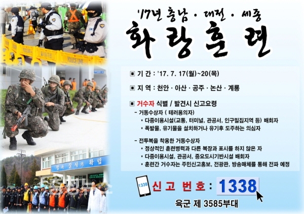 시 관계자는 “중요한 훈련인 만큼 성과 있는 훈련이 될 수 있도록 훈련 기간에 종합운동장이나 관공서 등 다중이용시설에서 민간인 복장의 거동수상자나 정글모를 착용한 가상 적군을 발견하면 1338 또는 경찰(112)로 신고해 줄 것”을 당부했다.