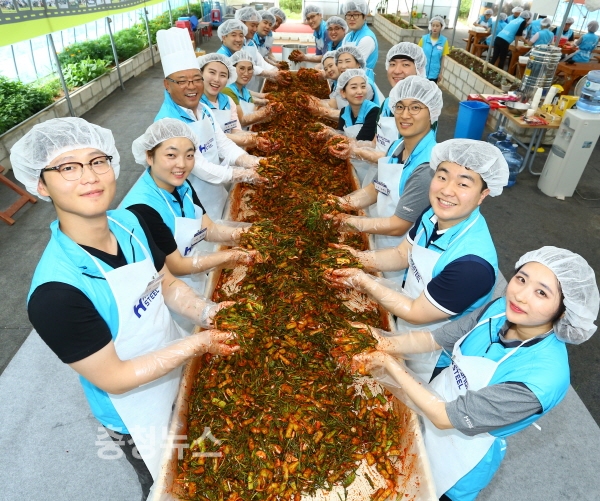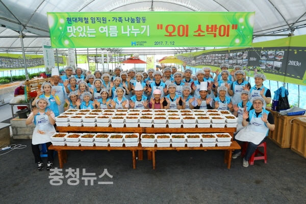현대제철 임직원 봉사단이 12일 ‘오이 소박이, 오이 물김치’ 총 200통을 담가 지역 32개 복지시설에 전달했다.