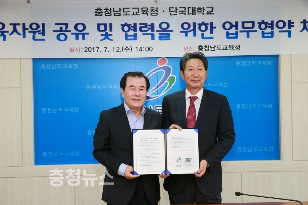충남도교육청(교육감 김지철)은 12일 도교육청 제1회의실에서 단국대학교(총장 장호성)와 업무 협약을 체결하고 협약서를 교환했다.
