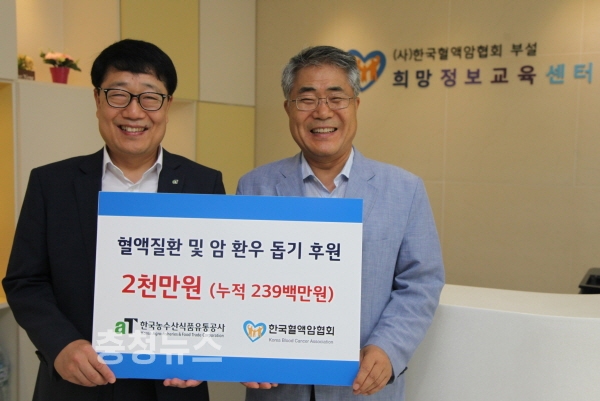 한국농수산식품유통공사(사장 여인홍)는 12일 (사)한국혈액암협회 부설 희망교육정보센터에서 혈액질환 및 암 환우를 위한 치료비 후원금 2천만 원을 전달했다고 밝혔다.