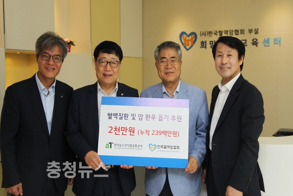 한편, aT는 지난 2006년 (사)한국혈액암협회와 MOU를 체결한 이후, 급성골수성백혈병과 악성림프종 등의 질환으로 매년 많은 의료비를 부담하고 있는 환우 가정에 현재까지 총 2억3천9백만 원의 치료비와 후원금을 지원해 왔으며, aT 임직원들도 꾸준히 개인 후원에 참여하고 있다.