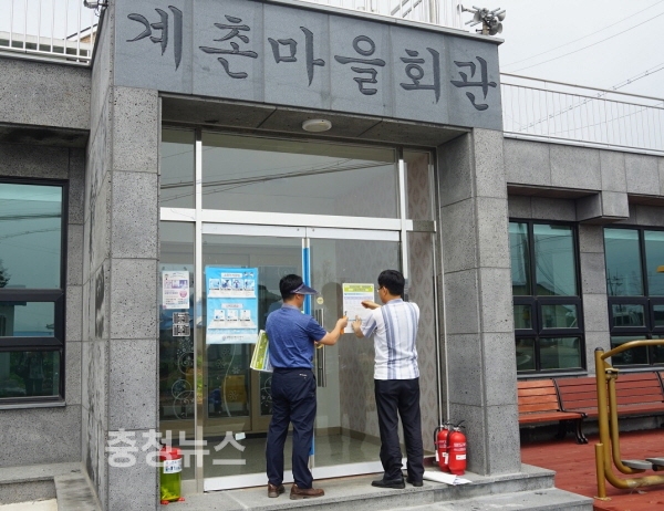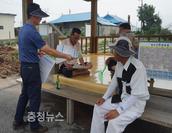 신암면 계촌리 마을회관에 이삭거름 적기 시용 홍보 전단지를 부착하고 있다