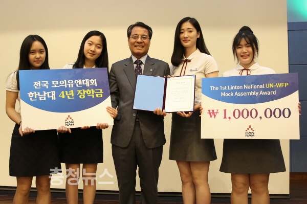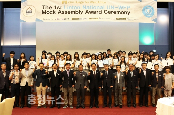 이번 행사는 지난달 3일 한남대 린튼글로벌비즈니스스쿨이 국내 대학 최초로 유엔세계식량계획(WFP)의 공식후원을 받아 개최한 ‘제1회 전국고등학교 모의UN-WFP총회’에 대한 시상식이다.
