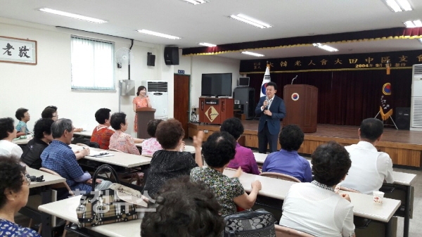 노인대학 종강식에 참석한 박용갑 구청장 인사말 모습
