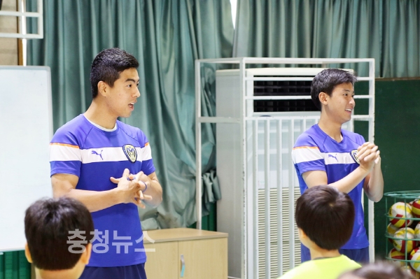 충남 아산무궁화프로축구단 선수들이 아산 둔포초등학교 어린이들의 일일교사로 나서 재밌는 추억을 선사했다.