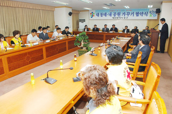 대전광역시 중구(구청장 이은권)는 시민들에게 깨끗하고 쾌적한 도시환경과 휴식공간을 제공할 목적으로 조성된 도심 공원을 효율적인 관리 체계를 구축하기 위해 9월 5일 오후 3시 중회의실에서 중구청과 학교, 기관․단체 간 내동네․내공원 가꾸기 협약식을 가졌다.