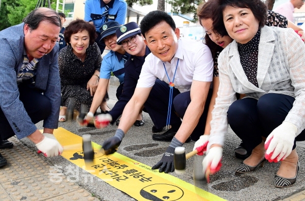 구는 교통시설물 설치를 희망한 초등학교 22개교 44개소에 대한 현지조사를 마치고 노란발자국과 보행중 스마트폰 사용의 위험성을 알리는 교통안전표지를 본격적으로 설치하고 있다.