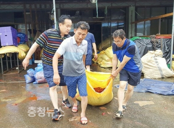 천안 원성동 고추시장 침수 상인들을 위로하며, 일손 도와