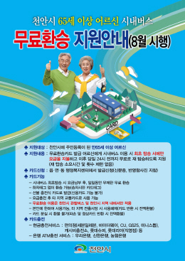 시에 따르면 천안시에 주민등록을 둔 만 65세 이상 시민이면 무료 환승카드를 발급 받아 최초 탑승 시에만 요금을 지불하고 당일 24시 전까지 추가 요금 없이 환승할 수 있도록 지원한다.