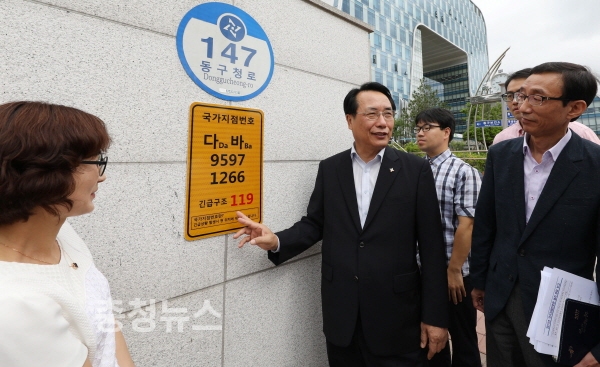 17일 동구청사 입구에 국가지점번호판 부착과 함께 주민홍보