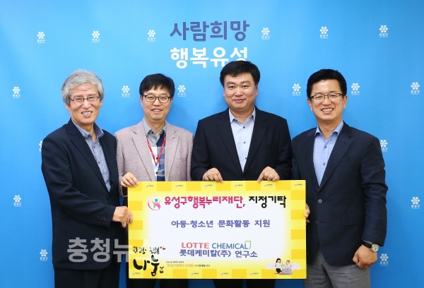 대전 유성구(구청장 허태정)는 17일 롯데케미칼(주)연구소(연구소장 강경보)가 행복누리재단에 성금 300만원과 후원물품(PC) 200만원 상당을 기탁했다고 밝혔다.