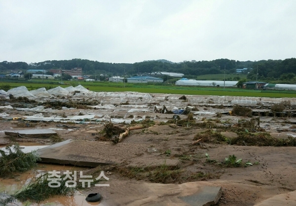 천안시 병천면의 경우 253mm 등 삽시간에 내린 폭우로 인해 도심 하천 범람과 병천면 장산리 지역의 제방이 유실되어 인근 비닐하우스 10여동을 덮쳐 애써 키운 농작물이 흙더미에 묻히고 농경지가 침수되는 등 큰 피해를 입었다.