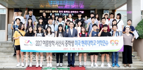 충남 서산시는 지역 중학생 32명이 18일 미국 롱비치시에 위치한 핸콕대에서 4주간의 일정으로 어학연수를 위해 출발했다고 밝혔다.