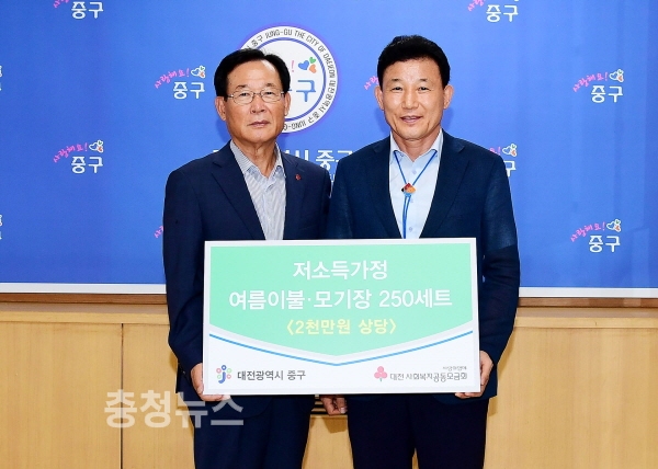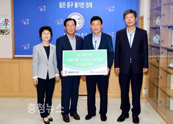 구청 구민사랑방에서 개최된 이번 전달식에는 박용갑 청장과 안기호 회장 등이 참석했으며, 전달받은 물품은 중구지역의 저소득층 250세대에 전달될 예정이다.