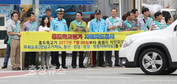 한편 이날 동구의회 박선용 의장을 비롯한 의원들도 삼성동성당 앞 네거리에서 홍도육교 통행차단을 알리는 홍보캠페인을 전개했다.