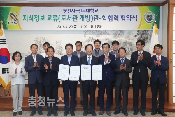 충남 당진시와 선문대학교가 20일 당진시청 해나루홀에서 김홍장 시장과 황선조 총장 등 10여 명이 참석한 가운데 지식정보 교류를 위한 관-학 협약을 맺었다.