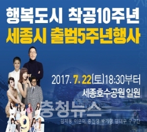 행정중심복합도시(이하 행복도시) 착공 10주년과 세종특별자치시(이하 세종시) 출범 5주년을 축하하는 기념행사가 오는 22일 오후 6시 30분부터 세종호수공원에서 열린다.