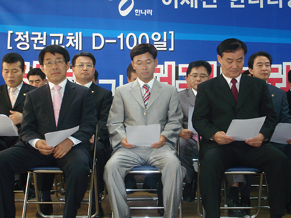 이 전의원은 "오늘로 12월 19일 치루어지는 17대 대통령선거는 정확하게 100일 남았다"며" 이제 무능과 부패로 얼룩진 좌파정권을 종식시키기 위해 오늘 이 자리에 서기까지 과연 어떻게 하는 것이 진정으로 나라와 당을 위하는 길인가에 대해 많은 고민을 했다"고 말했다.