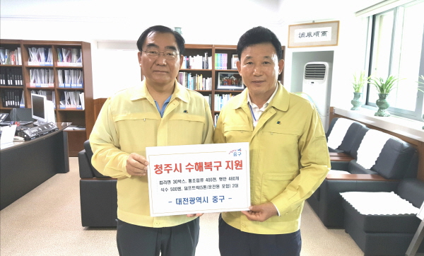 대전 중구(구청장 박용갑)는 20일 최악의 물 폭탄 집중호우로 도심 곳곳에 침수피해가 발생한 청주 미원면의 수해복구 지원을 위해 생필품과 함께 덤프트럭과 운전요원을 현지로 파견했다.
