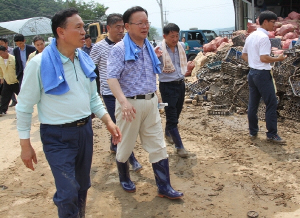또 “농경지와 축사, 삶의 터전을 잃은 피해주민들에게 위로의 말씀을 전한다”고 말하고, “수재민들의 빠른 생활안정을 위해 조속한 복구와 제2차 피해방지를 위해 영구적인 해결 방안을 모색해 달라”고 당부했다.