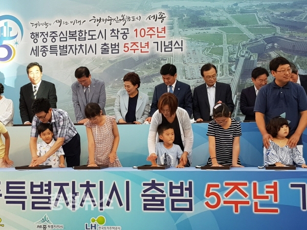 끝으로 이날 기념식은 행정중심복합도시 착공 10주년·세종시 출범 5주년'의 의미를 담아서 행복도시 착공식이 개최된 해에 태어난 ‘행복둥이(10세)’와 세종시가 출범한 해에 태어난 ‘세종둥이(5세)’가 핸드프린팅 퍼포먼스를 하며, 새로운 미래를 위한 도약을 다짐했다.