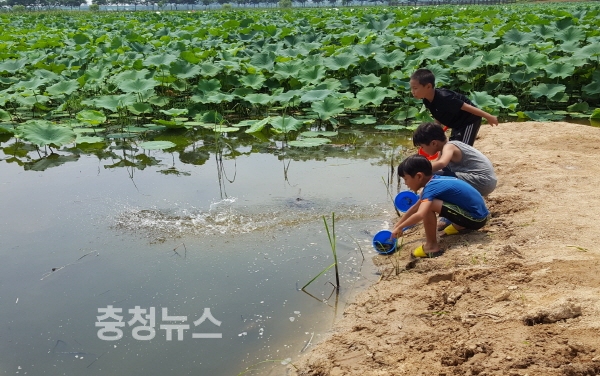 아빠, 엄마와 함께 고사리 같은 손으로 물고기들을 풀어주고, 지난해 서해선 복선전철 공사현장 3공구에서 발견돼 합덕제를 새 터전으로 삼은 금개구리와 수원청개구리가 연잎 사이를 노니는 모습을 보면서 아이들은 자연스럽게 동물 친구들과 교감했다.