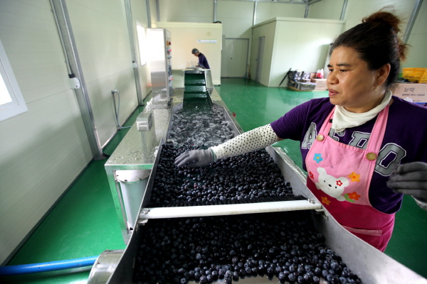 이 시스템은 블루베리를 수확한 직후 저온저장고에서 7~8시간 정도 예냉한 뒤 살균과 세척, 탈수 시스템(60㎏/시간)으로 처리해 생과로 유통하거나, 급속 냉동시킨 후 냉동과로 유통할 수 있다.