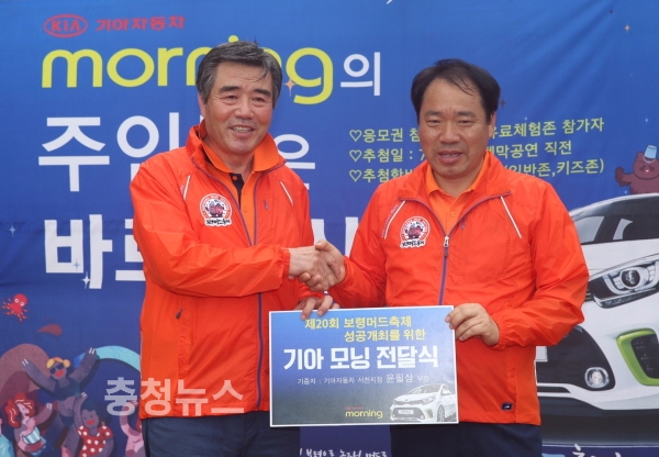 지난 21일 기아자동차 뉴모닝 경품 기탁 장면(좌측 김동일 보령시장, 우측 윤필상 부장)