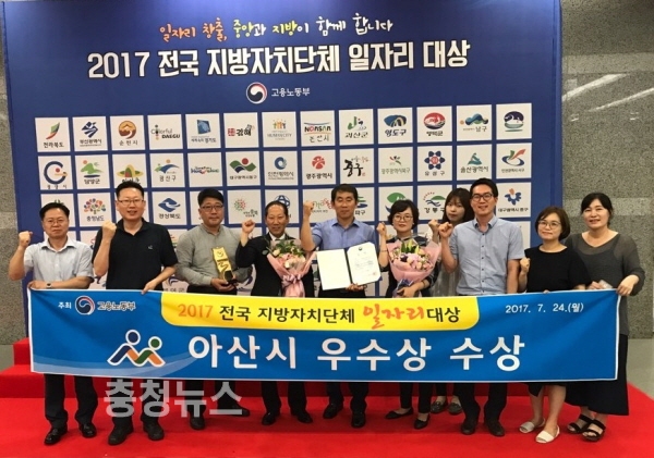 충남 아산시(시장 복기왕)가 고용노동부가 주관한‘지역일자리 목표 공시제’추진실적 평가 결과 우수 자치단체로 선정되어 지난 24일‘2017년 전국 지방자치단체 일자리 대상’시상식에서 기관표창과 함께 9,000만원의 인센티브를 받았다.