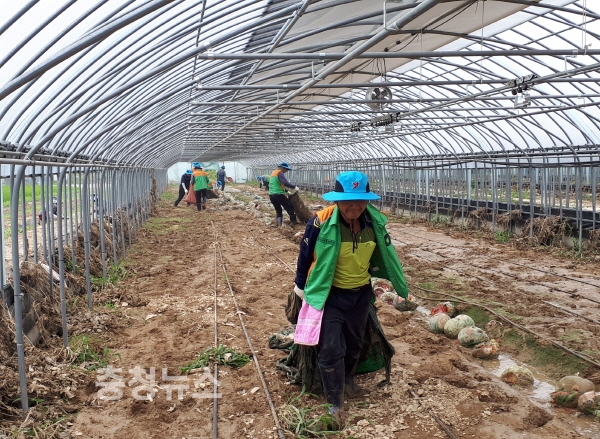 이날 청양군 현장복구 지원인력은 침수피해가 심각한 수박재배 비닐하우스 농가를 방문 습기와 펄, 수박 썩는 냄새가 진동하는 열악한 상황에서 흙과 오물을 제거하고 비닐을 걷어내는 등 수해를 입은 농민의 마음을 생각하며 복구 작업에 끊임없는 구슬땀을 흘렸다.