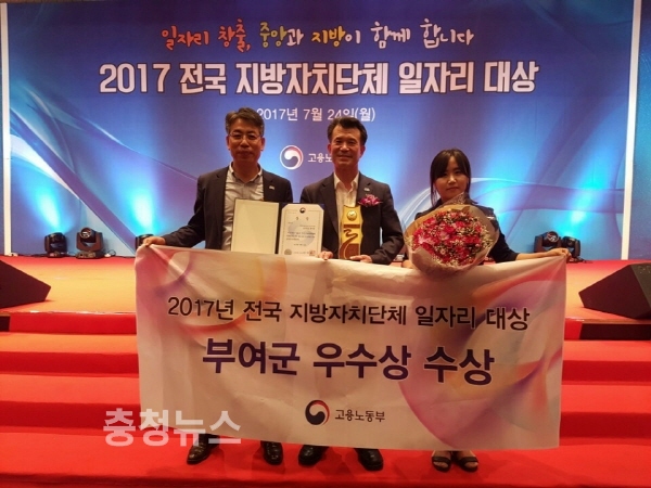 충남 부여군(군수 이용우)은 지난 24일 고용노동부에서 주관하는 2017년 전국 지방자치단체 일자리대상 우수상 수상의 쾌거를 이뤘다.