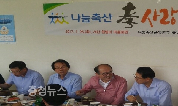 농협 충남지역본부(본부장 유찬형)는 나눔축산운동본부 충남도지부(천안축협조합장 정문영)는 25일 서산시 운산면 원벌리 마을회관에서 마을주민 80여명에게 삼계탕을 대접하고 마을회관에 2백만원 상당의 가전제품를 전달하는 등“ 孝 사랑나눔 행사”를 가졌다.