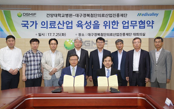 건양대병원과 건양대 의료공과대학은 25일 오전 대구경북첨단의료산업진흥재단(이사장 이재태)과 국가 의료산업 육성을 위한 업무협약을 체결했다.