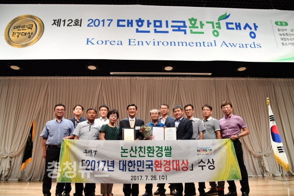 충남 논산시(시장 황명선)가 26일 서울 중소기업중앙회에서 열린 ‘제12회 2017 대한민국 환경대상’ 시상식에서 친환경농산물부문(쌀) 대상 수상의 영예를 안았다.