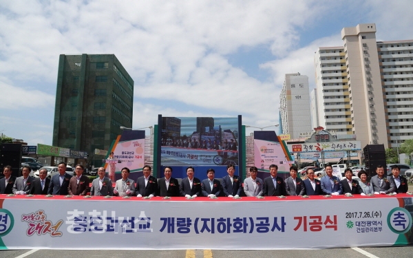 이날 홍도육교 개량공사 현장에서 개최된 기공식 행사에는 권선택 시장을 비롯해 김경훈 시의회 의장, 이장우 국회의원, 한현택 동구청장, 박수범 대덕구청장 등 주요인사와 관계자, 지역 주민 등 300여 명이 참석했다.