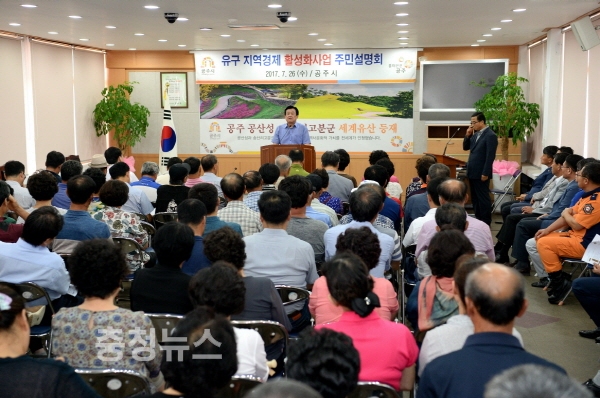 충남 공주시(시장 오시덕)가 지난 26일 유구읍 행정복지센터 회의실에서 지역 주민과 유관기관·단체 관계자 등 120여명이 참석한 가운데 ‘유구 지역경제 활성화 사업’에 관한 주민설명회를 개최했다.