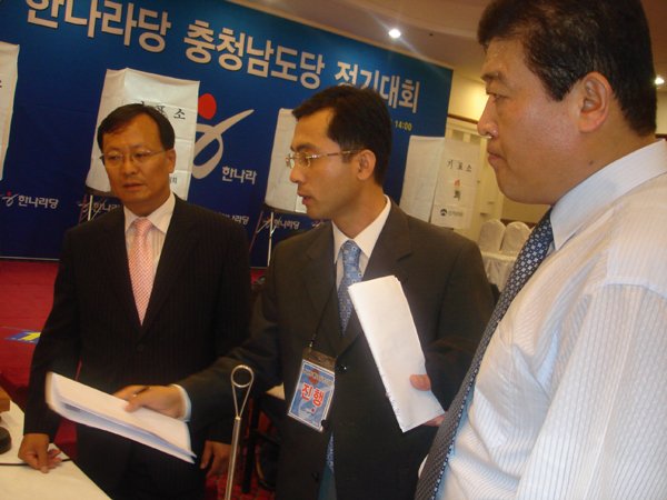 한나라당 충남도당위원장 선거에서 박근혜 전 대표측의 전폭적인 지지를 얻은 기호2번 이진구 후보가 이명박 후보측 홍문표 후보를 36표차이로 신승 신임 충남도당위원장에 선출됐다.