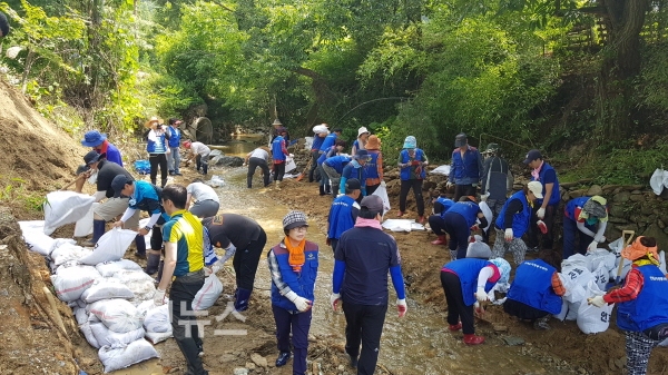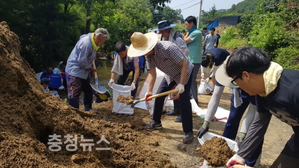 이날 이순선 군수를 비롯한 공무원 40명과 자원봉사자 30명 등 70명은 집중호우로 피해가 컸던 목천읍 서흥리 일대를 방문해 하천제방에 마대를 쌓고 토사를 정비하면서 구슬땀을 흘렸다.